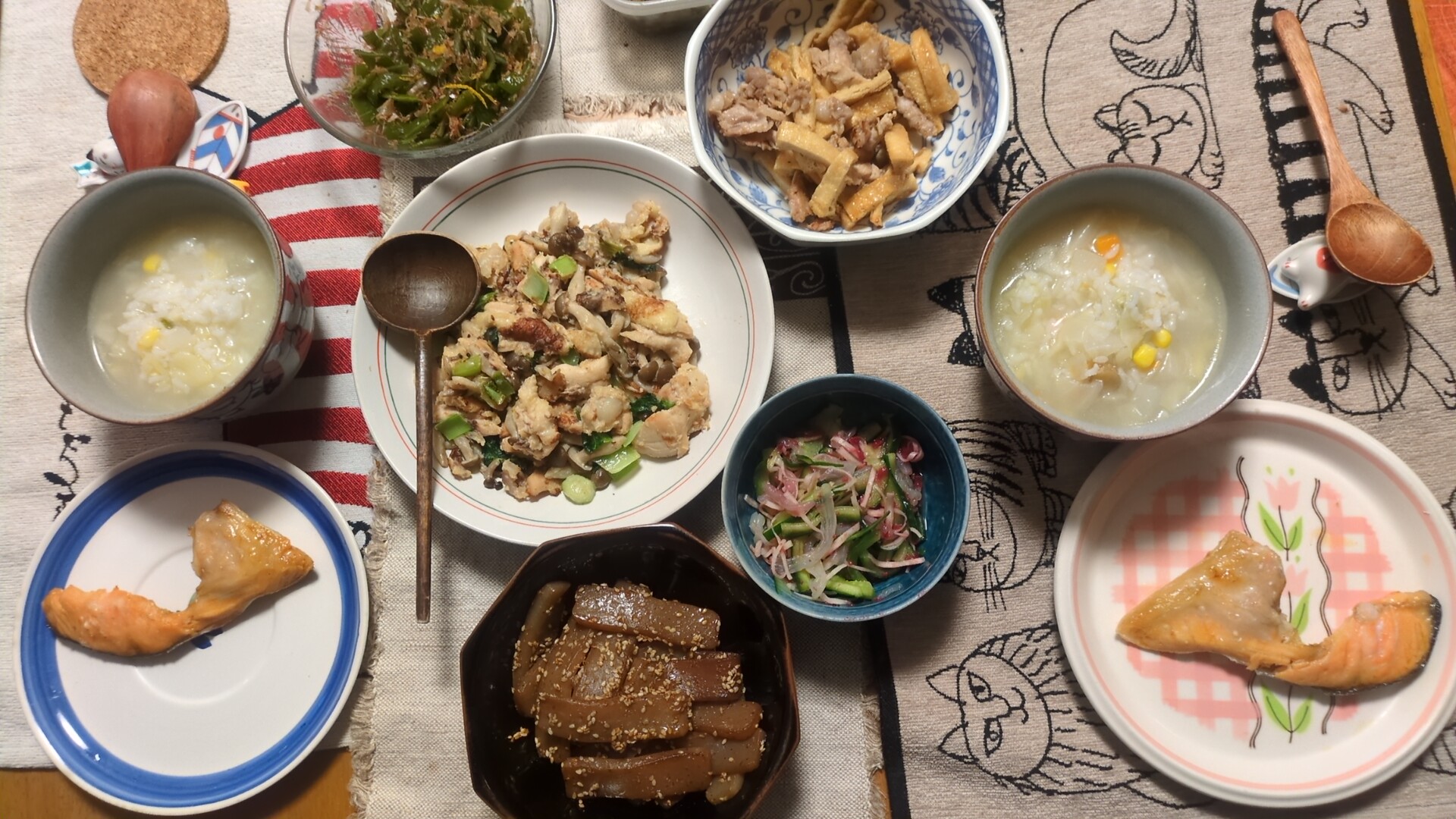 きょうの晩ご飯(E)は: 野菜いっぱいのブブールメナド --- インドネシアのスラウェシ島北部のメナド特産のお粥(かい)さんだ。 塩鮭。その他いろんなトッピング。