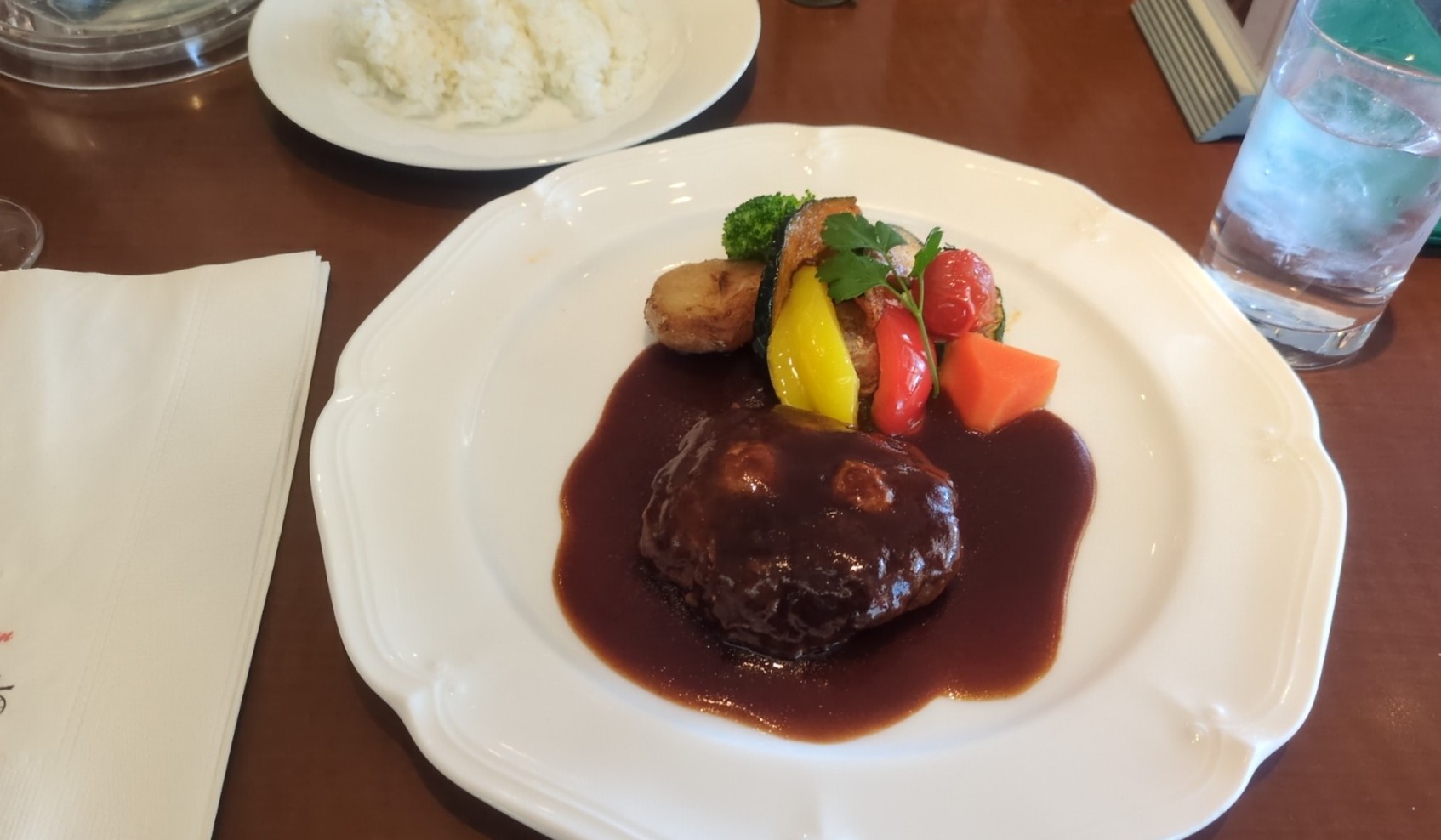 お子様ランチを注文するのを必死にこらえてハンバーグライス。 昼からビールも飲んで、しあわせ・・・🥰